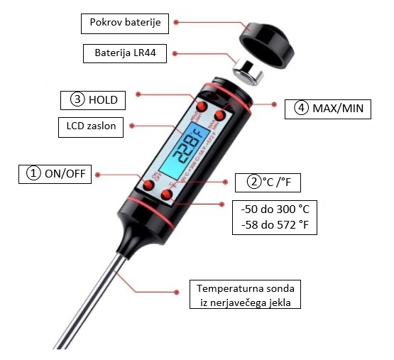 Digitalni termometer s tako širokim razponom merjenja je nepogrešljiv pripomoček v vsakem domu. Termometer ima 4 funkcijske tipke s povsem preprosto uporabo. S tipko ① ON/OFF termometer vključimo ali izključimo. S tipko ② °C /°F določimo enoto merjenja. S pritiskom na tipko ③ HOLD zaustavimo merjenje, da lažje razberemo temperaturo. S ponovnim stiskom tipke HOLD je termometer pripravljen za nadaljnje merjenje. S pritiskom na tipko ④ MAX/MIN pa se najprej prikaže najvišja izmerjena temperatura, s ponovnim pritiskom še najnižja izmerjena temperatura. Podatke izbrišemo, če tipko MAX/MIN pritisnemo še tretjič.